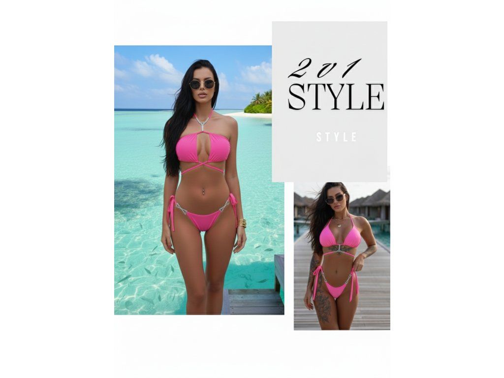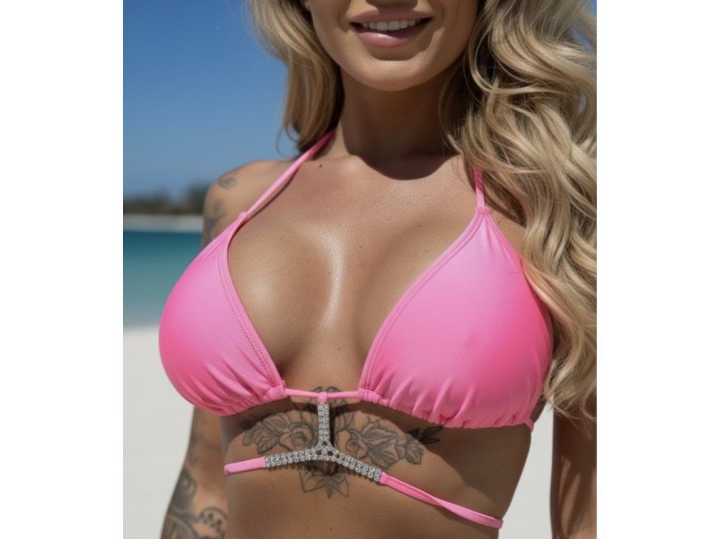 Vrchní díl bikini v Barbie růžové barvě, zavazovací, s vkládacími push-up košíčky pro dokonalý tvar a podporu. Redukce velikosti umožňuje přizpůsobení podle potřeby. 2v1 design, který mění vzhled, vyrobený z kvalitní italské látky s vysoká gramáž. Testováno na ÚV záření 50C. Precizní ruční šití a autorský design, který je jedinečný. Plavky jsou doplněné o šperky, pro extra eleganci a sofistikovanost.